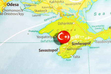 Close-up view of Crimea on a geographical globe with Sevastopol, Simferopol city. Map shows peninsula with pin turkish Flag. Focus point on pushpin area. former Ukraine territory now Russia territory.