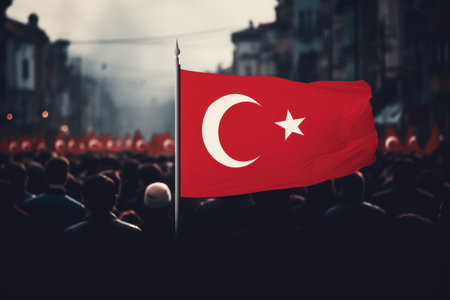 A large Turkish flag, with its vivid red background and white star, is proudly showcased during a celebration symbolizing national pride, unity, and the cultural heritage of the Turkish people
