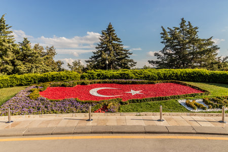 Turkish flag in front of the Mausoleum complex of Mustafa Kemal Ataturk (Anitkabir) in Ankara, Turkey