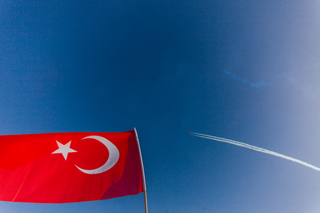 Red Turkish flag with a star and crescent on a blue sky