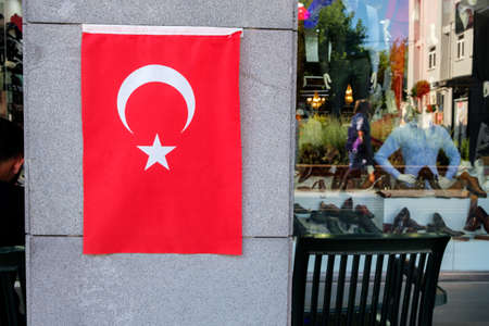 the flag of Turkey is vertically located on the column of the building background vertina. trade in Turkey is booming