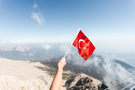 Turkey flag in a male hand against the backdrop of Taurus Mountains in sunset from a viewpoint of Tahtali Mountain. Tahtali Dagi, Antalya Province, Turkey