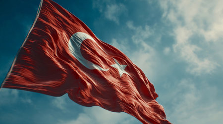 Turkish flag waving against a bright blue sky, symbolizing national pride and identity during a sunny afternoon