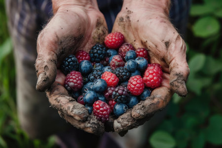Weathered Berries farmer hands. Farmer holding fruits. Generate Ai