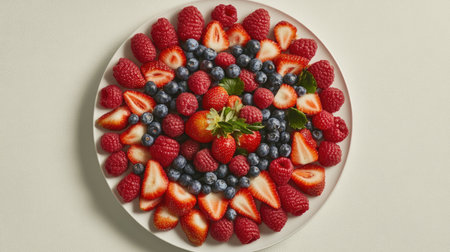 A vibrant arrangement of fresh raspberries, strawberries, and blueberries on a round plate, perfect for healthy snacks or summer gatherings.