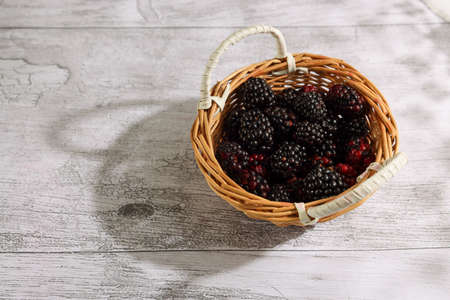 Ripe mulberries on white a dish on the table. Tasty berry with copy space for text. Top view. Concept of healthy fruit.