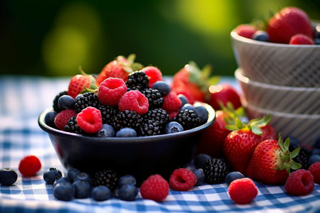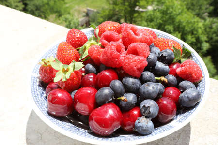 Bowl filled with strawberries, blueberries and cherries in the garden. Selective focus.