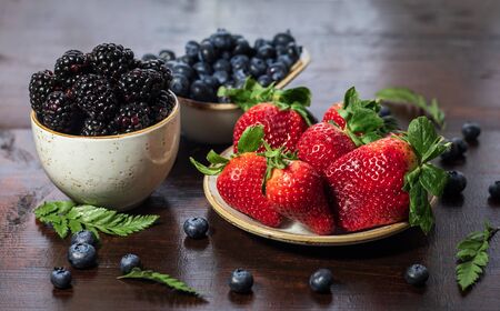 Fresh berries on a dark wooden background. Blackberries, strawberries and blueberries in a white bowl on the table. Food background.