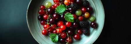 A colorful display of strawberries, cherries, blackberries, and red currants arranged on a rustic plate, showcasing a delightful summer harvest, banner