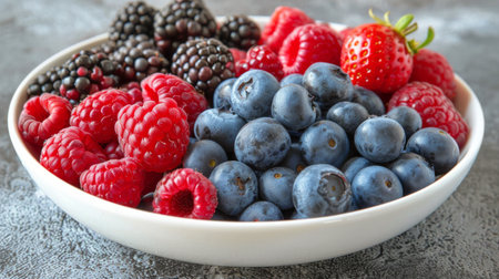 A white bowl filled with a variety of fresh berries, including blueberries, creating a colorful and nutritious display.