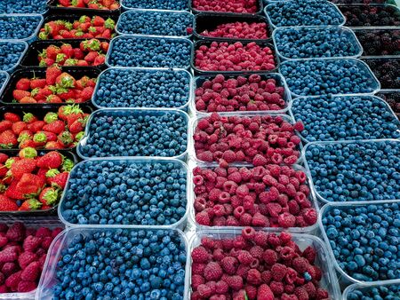 Various fresh berries Fruits in Plastic Trays on food market stall.