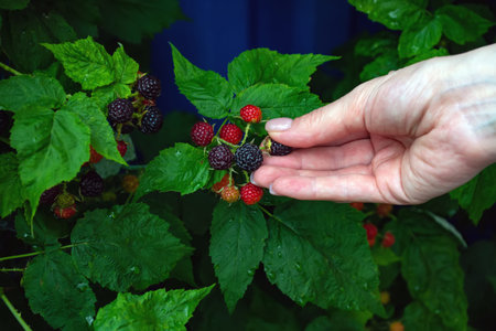 woman's hand picking berries or harvest. Blackberry bush on a branch close-up. Collecting berries. Ripe blackberries on a green background