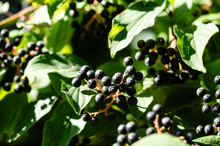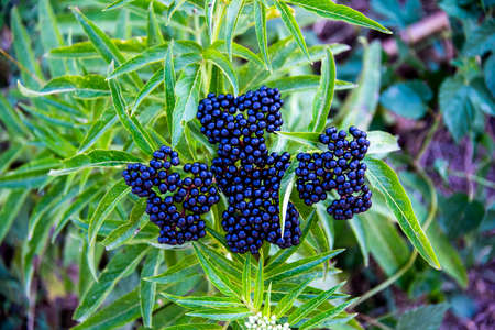 Clusters fruit black elderberry in garden in sun light (Sambucus nigra). Common names: elder, black elder, European elder, European elderberry and European black elderberry.