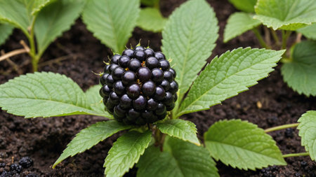 Fresh blackberries and dew-covered leaves in a lush garden nature scene
