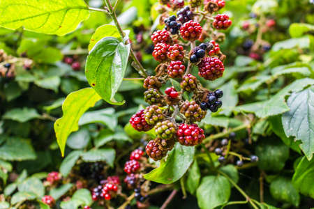 Red and black wild blackberries bushes and branches on green leaves background in Italian garden during a sunny summer day