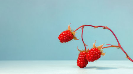 A close-up image of fresh red raspberries on a delicate branch against a soft blue background, ideal for healthy eating, nutrition, or summer-themed projects.
