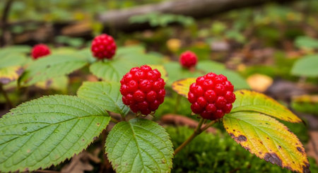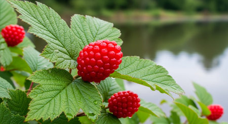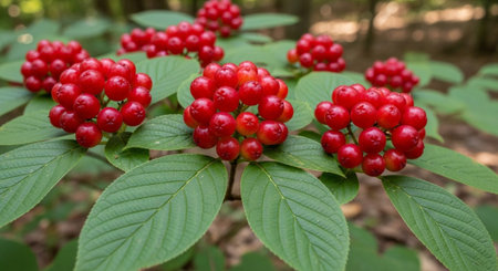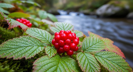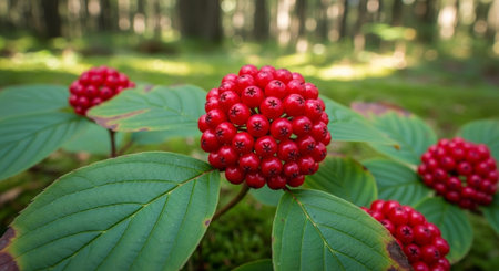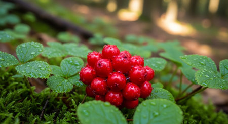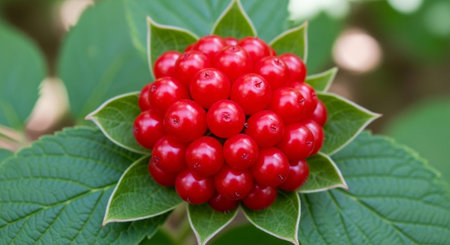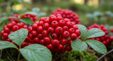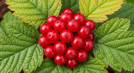 Close-up view of vibrant red berries nestled among lush green leaves, showcasing nature's beauty with rich colors and a serene atmosphere perfect for seasonal themes.