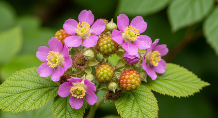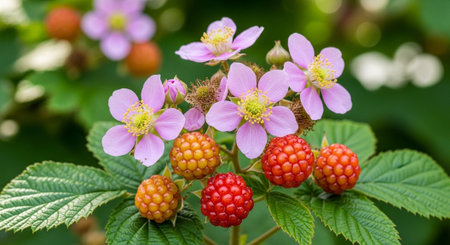 Close-up of black raspberry on stem with vibrant pink flower petals. That the image is generated using AI.