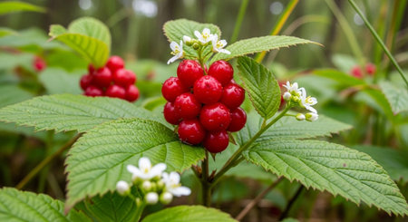 An AI generated illustration of a fresh raspberry bush blooming in a sunny lush green grassy field