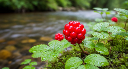 Detailed macro shot of a fresh red raspberry on a vine. The green leaves are covered in glistening water drops from a recent rain. Moody and natural background.