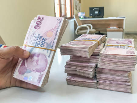 Turkish Liras currency money bills. TRY currency banknotes in stack with different denomination close up