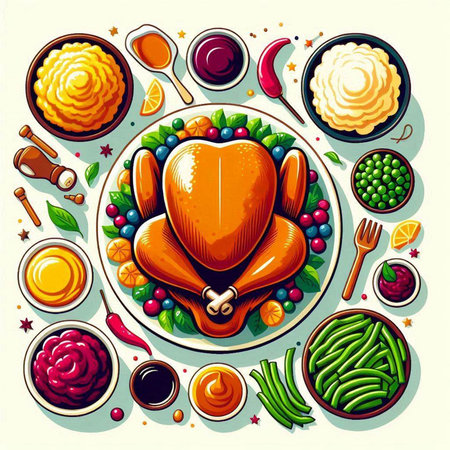 Thanksgiving Day party table with tradition food. Top view.