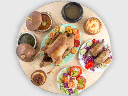 Round table with roasted chickens and soups