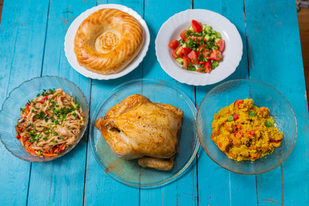 Whole roasted chicken with rice and salad served on the table.