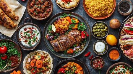 Top view of different traditional Turkish and Greek dishes on dark background.