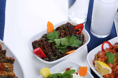 Turkish and Greek Traditional Dinning Table with Special Alcohol Drink Raki. Ouzo and Turkish Raki is a dry anise flavored aperitif that is widely consumed in Turkey, Greece, Cyprus and Lebanon