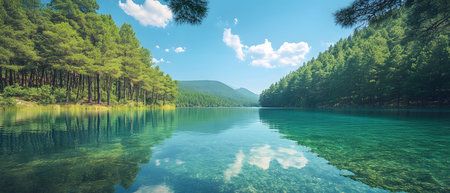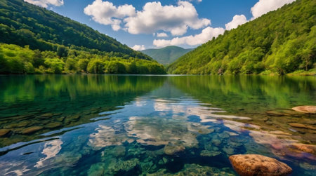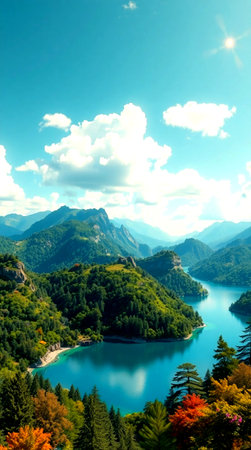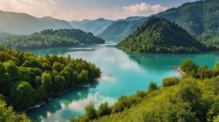 Cinematic view of a serene lake embraced by lush mountains and vibrant colors