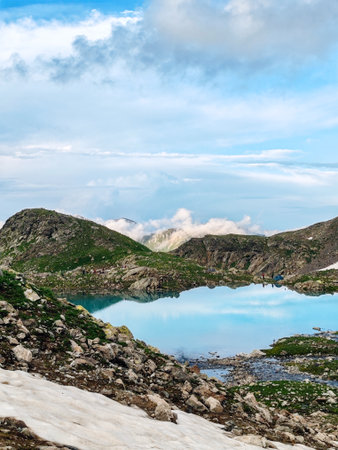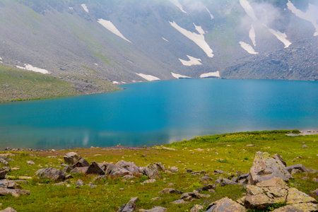Mountain lake in the clouds. Summer landscape in the mountains.