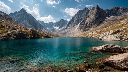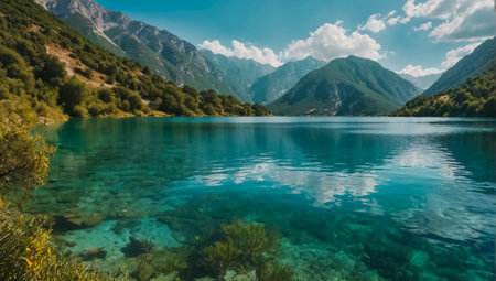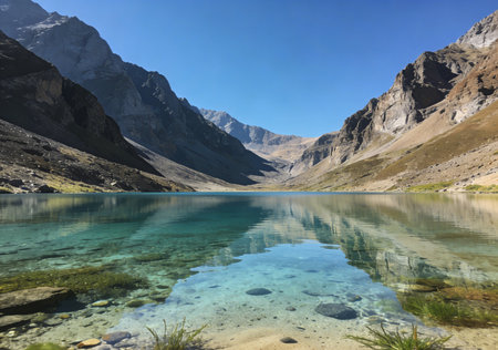 Tranquil alpine mountain lake landscape with serene reflection and clear blue sky surrounded by majestic mountains in untouched wilderness