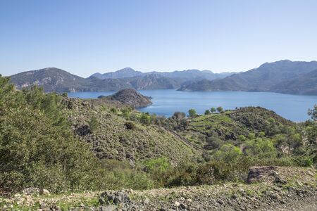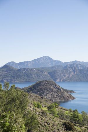 Beautiful scenery of bay and mountains and blue sky. Mediterranean sea coast. Nature of Turkey.