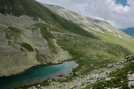A mountain valley landscape with green hills, turquoise lake and white clouds. Two little blue tents among majestic wild nature. Domestic travel trekking. Local tourism