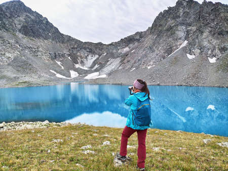 Young girl photographed mountain lake