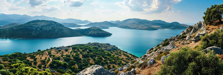 Mountain, sea, sky landscape. Picturesque nature view background in Turkey