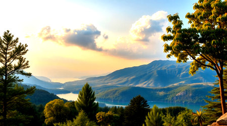 Beautiful landscape with lake and mountains in the background. 3d rendering