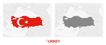 Two versions of the map of Turkey, with the flag of Turkey and highlighted in dark grey. Vector map