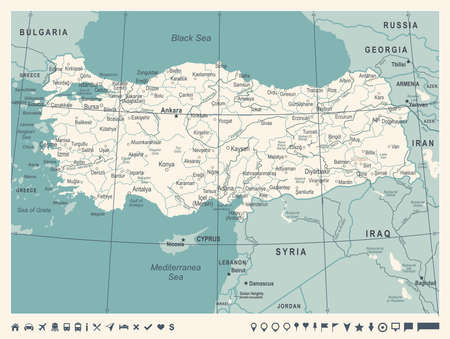 Turkey map blue colors and colored map icons. Image contains layers with map contours, land names, city names map icons - Highly detailed vector illustration.