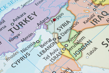 Close up to a Damascus city with a black pin needle into Syria country political map
