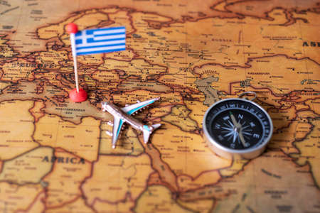 Greek flag, compass and plane on the world map. The concept of travel and tourism.