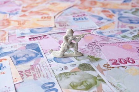 Miniature toy soldier on the background of banknotes of different values.