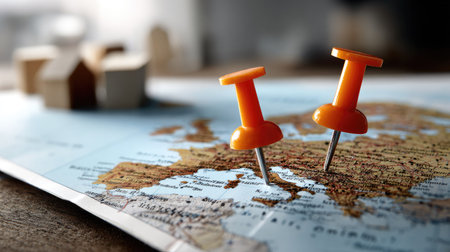 This image features a close-up view of orange push pins marking specific locations on a colorful map of Europe, set against a wooden background.