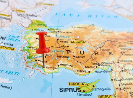 Close up to a Izmir city with a red pin needle into Turkey country political map