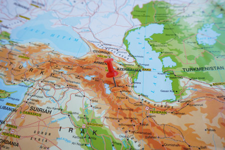 View of Tabriz, is a city in the Central District of Tabriz County, in East Azerbaijan province of northwestern Iran, on geographical map of Asia, marked with red push pin