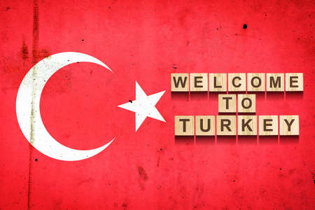Welcome to Turkey. The inscription on wooden blocks on the background of the flag of Turkey. Travels.