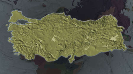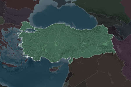 Turkey area enlarged and glowed on a darkened background of its surroundings. Colored and bumped map of the administrative division
