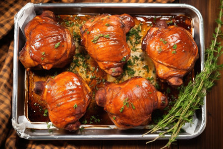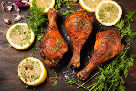 overhead shot of bbq chicken drumsticks with herbs and spices, created with generative ai