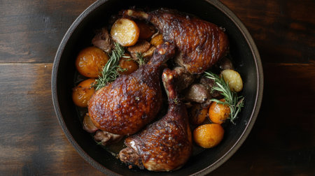 A mouthwatering display of roast chicken legs accompanied by vibrant root vegetables and aromatic herbs, perfect for family gatherings and cozy meals.